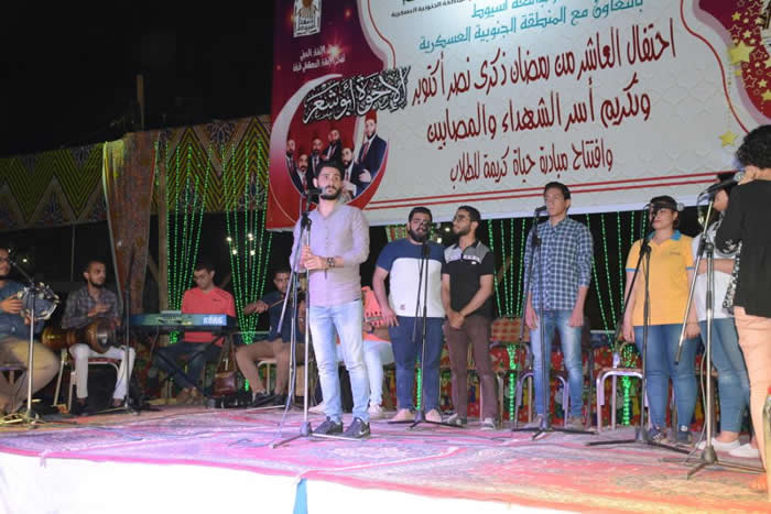 جاء ذلك خلال الاحتفال الذي نظمته الجامعة احتفالاً بذكرى العاشر من رمضان وذلك بحضور ضيوف الجامعة اللواء جمال نور الدين محافظ أسيوط واللواء أركان حرب أيمن نعيم رئيس أركان المنطقة الجنوبية العسكرية والدكتور شحاته غريب نائب رئيس الجامعة لشئون التعليم والطلاب والدكتور أحمد المنشاوي نائب رئيس الجامعة للدراسات العليا والدكتورة مها غانم نائب رئيس الجامعة لخدمة المجتمع وتنمية البيئة ، واللواء عمر عبد العال مساعد وزير الداخلية لوسط الصعيد واللواء حاتم رياض مفتش مباحث الأمن الوطني والدكتور عاصم القبيصى وكيل وزارة الأوقاف والفنان خالد الصاوي .