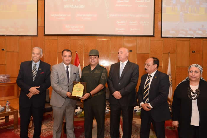 وفى هذا الإطار أشار الدكتور شحاتة غريب إلى تكريم الجامعة للعميد أركان حرب بهاء عبد الناصر لدعم المنطقة الجنوبية العسكرية لأنشطة وفاعليات الجامعة ، كما كرم اللواء أركان حرب عبد الوهاب سيد عبد العال والعميد محمد عبد المنعم يوسف عن دورهم البطولي في حرب أكتوبر المجيدة ، كذلك كرمت الأستاذة نسرين جمعة عضو المجموعة 73 مؤرخين على دور الجمعية فى تأريخ بطولات أكتوبر التى لم تدون ، حيث أشار نائب رئيس الجامعة أن فاعليات الملتقى شهدت أيضاً تكريم إدارة الجامعة لشهداء الشرطة المصرية بعد أن قامت الجامعة خلال حفل ختام مؤتمر مصر تستطيع بتكريم شهداء القوات المسلحة وذلك تقديراً وعرفاناً لتضحياتهم الغالية ودورهم فى حماية الوطن والدفاع عن شعبه ، حيث كرمت أسرة الشهيد العقيد نبيل خليل جيد ، و المقدم مهران عبد الرحيم سيد ، و المقدم أبوبكر عزمي عبد القادر ، و المقدم مصطفى محمود خليل ، و الرائد عنتر أحمد عبد الحفيظ ،و الرائد أحمد جلال محمد ، و الرائد محمد جمال عبدالرحمن ، و النقيب عيسى كرم عيسى ، و النقيب أحمد رضوان عبد الجواد ، و النقيب مصطفى محمد عثمان ، وأمين شرطة محمد بدرى أحمد، وأمين شرطة مظهر أحمد حسن ، وأمين شرطة فرغلى سعد فرغلى ، وأمين شرطة مصطفى عيد محمود ، وأمين شرطة مجدي شوقى موسى ، ومساعد أمين شرطة ناصر محمود على ، المجند عبدالرحيم حشمت حرب ، المجند حسن جمال حسن ، المجند مرزق عطا أحمد ، المجند محمد أبوالعلا تركى .