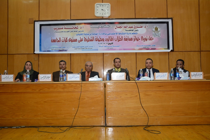 وفي هذا الإطار شهد الدكتور شحاته غريب شلقامي نائب رئيس الجامعة لشئون التعليم والطلاب حفل تكريم الطلاب الفائزين في بطولة الشطرنج والطلاب المثاليين علي مستوي كليات الجامعة , والذي نظمته إدارة النشاط الاجتماعي بالإدارة العامة لرعاية الشباب بالجامعة , وذلك بحضور الدكتور عاطف فاروق القرن المشرف علي الأنشطة الطلابية بالجامعة , والأستاذ عز المنصوري مدير عام رعاية الشباب المركزية , والأستاذة أميمة إبراهيم مدير إدارة النشاط الاجتماعي , وبمشاركة ممثلي اللجنة العليا للأنشطة الطلابية وهم الدكتور سعودي محمد حسن مستشار اللجنة الاجتماعية , والدكتور محمد حسين موسي المدرس بكلية الحقوق ومستشار الاتحادات الطلابية , إلي جانب حشد كبير من السادة عمداء الكليات وأعضاء هيئة التدريس بالجامعة وقيادات الإدارة العليا لرعاية الشباب والطلاب الفائزين .