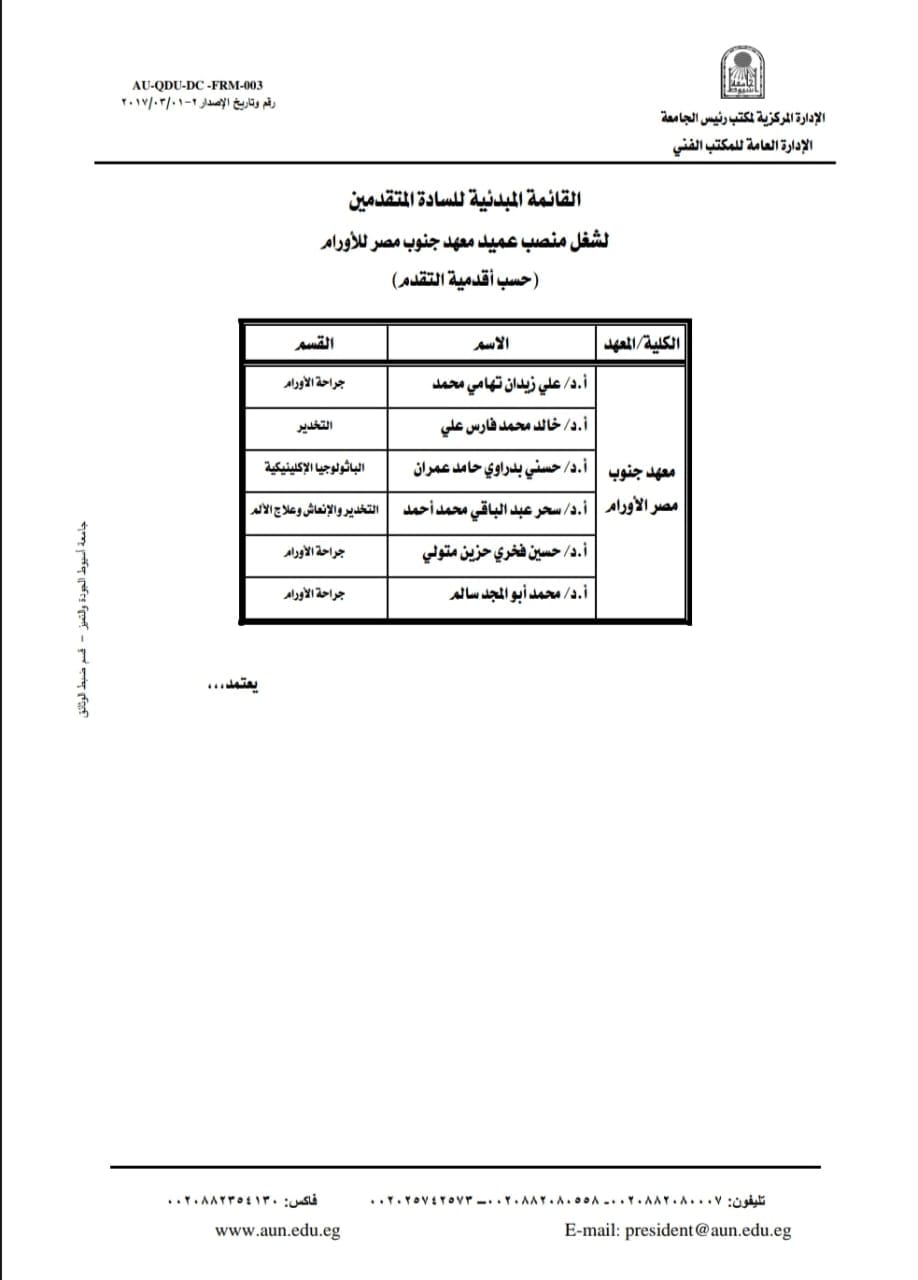 وتضم القائمة المبدئية لشغل منصب عميد معهد جنوب مصر للأورام؛ كلاً من: الدكتور علي زيدان تهامي محمد الأستاذ بقسم جراحة الأورام، والدكتور خالد محمد فارس علي الأستاذ بقسم التخدير، والدكتور حسني بدراوي حامد الأستاذ بقسم الباثولوجيا الإكلينيكية، والدكتورة سحر عبدالباقي محمد الأستاذ بقسم التخدير والإنعاش وعلاج الألم، والدكتور حسين فخري حزين الأستاذ بقسم جراحة الأورام، والدكتور محمد أبوالمجد سالم الأستاذ بقسم جراحة الأورام.