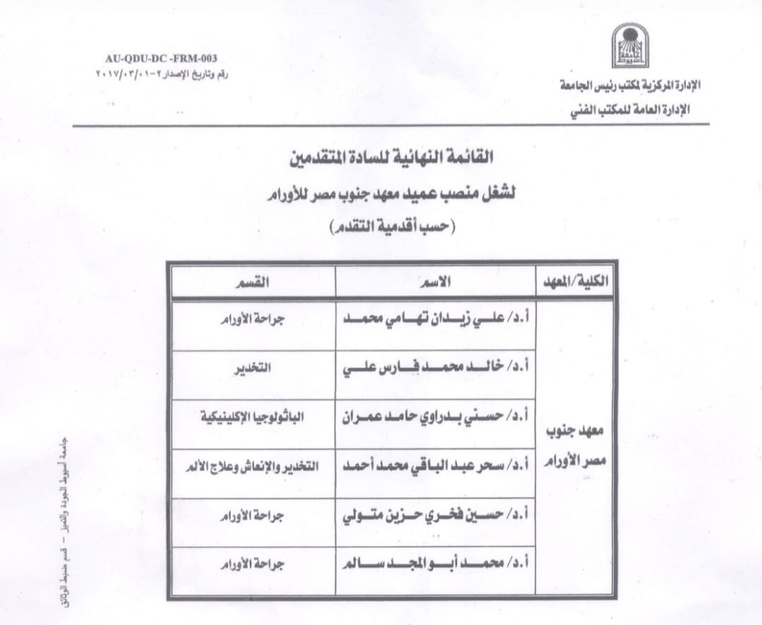 وتضم القائمة النهائية لشغل منصب عميد معهد جنوب مصر للأورام؛ كلًا من: الدكتور على زيدان تهامى محمد الأستاذ بقسم جراحة الأورام، والدكتور خالد محمد فارس على الأستاذ بقسم التخدير ووكيل المعهد لشئون الدراسات العليا والبحوث، والدكتور حسنى بدراوى حامد رئيس قسم الباثولوجيا الإكلينيكية، والدكتورة سحر عبدالباقى محمد رئيس قسم التخدير والإنعاش وعلاج الألم، والدكتور حسين فخرى حزين الأستاذ بقسم جراحة الأورام، والدكتور محمد أبوالمجد سالم الأستاذ بقسم جراحة الأورام ووكيل المعهد لشئون خدمة المجتمع وتنمية البيئة.