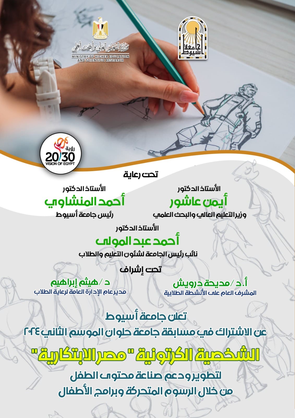 أعلن الدكتور أحمد المنشاوي رئيس جامعة أسيوط؛ عن بدء التقديم في الموسم الثاني من مسابقة جامعة حلوان لعام ٢٠٢٤، بعنوان: "الشخصية الكرتونية : مصر الابتكارية"؛ لتطوير، ودعم صناعة محتوى الطفل، من خلال: الرسوم المتحركة، وبرامج الأطفال، والتي يتم تنظيمها تحت رعاية الدكتور أيمن عاشور وزير التعليم العالي والبحث العلمي.
