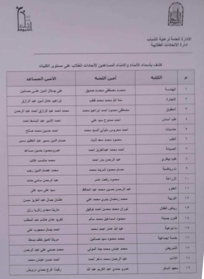 كما اعلنت جامعة اسيوط عن نتيجة الانتخابات فى كلية الصيدلة والتى اسفرت عن فوز احمد محمد عبد العزيز بمنصب الامين وعمرو محمود حسين بمنصب المساعد، وفى الطب البيطرى فاز الطالب عبد الرحمن بدر احمد بمنصب الامين، ومحمد منتسب غالب بمنصب المساعد،وفى التربية الرياضية فاز حسام محمود شريت بمنصب الامين و محمد عصام الدين رجب بمنصب الامين المساعد، اما محمود رفعت عامر فقد تم اعلانه امينا لاتحاد كلية الزراعة وعبد الرحمن سامى حامد مساعدا له، وعبد الرحمن حسين محمد امينا لاتحاد كلية العلوم وسيد على مساعدا له، ومحمد رمضان بدوى امينا لاتحاد كلية التربية و عثمان جمال عبد العزيز مساعدا له.