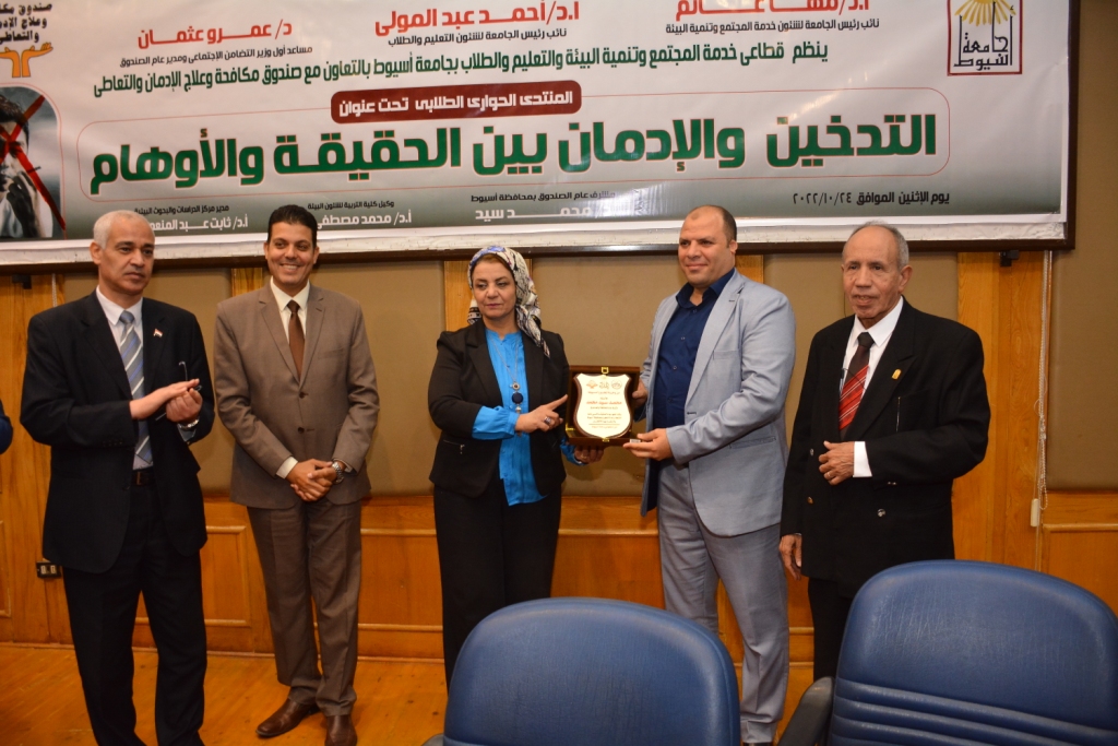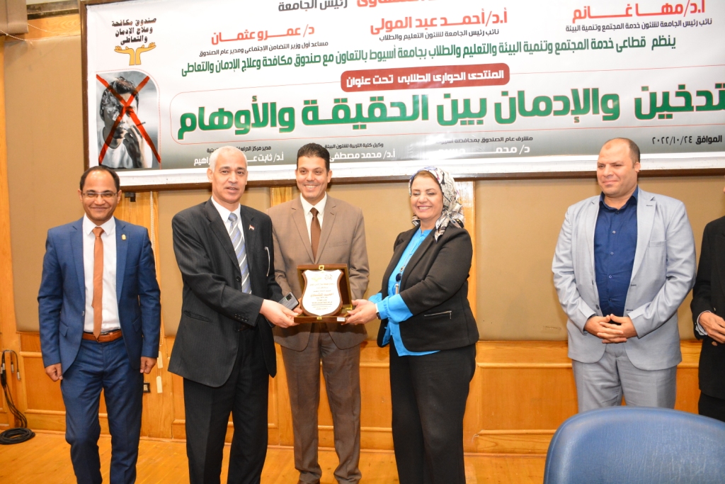 أكد الدكتور أحمد المنشاوى القائم بعمل رئيس الجامعة على حرص جامعة اسيوط ودعمها الدائم للأنشطة التى تسعى الى رفع مستوى وعى وادراك شبابها وأبنائها الطلاب تجاه افات العصر مثل التى تؤثر عليهم, صحياً ونفسياً فيعد التدخين من أكثر الظواهر إنتشاراً فهو كالوباء المخيف لهذا اصبح للمجتمع عامةً وللموئسسات التعليمية خاصةً مسئولية ودوراً هاماً نحو ابنائه بتوعيتهم بضرورة علاج لتلك الظاهرة، وأن تتكاتف الجهود وتتشارك مع الدولة للقضاء على الإدمان .