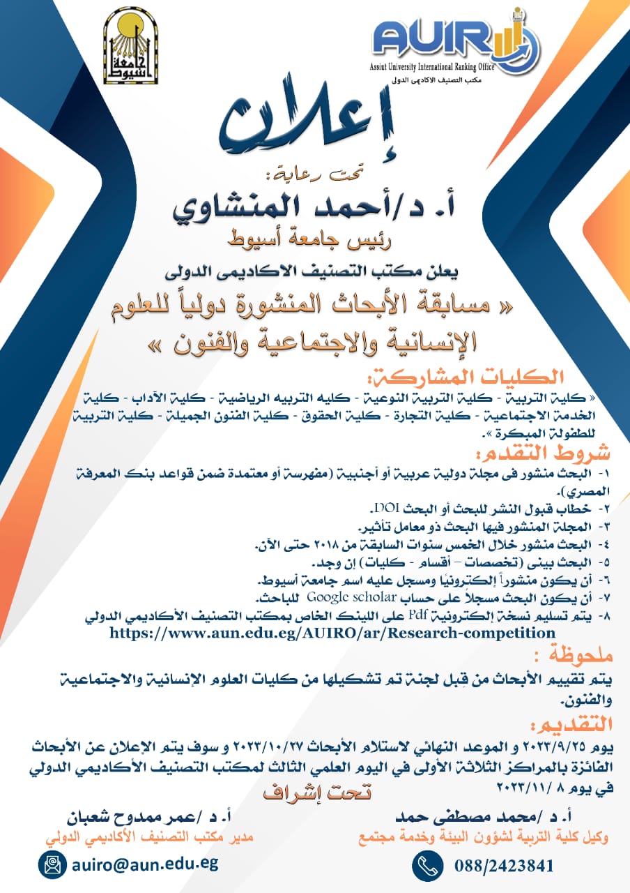 وأعلن الدكتور أحمد المنشاوي رئيس جامعة أسيوط؛ تفاصيل مسابقة "الأبحاث المنشورة دولياً للعلوم الإنسانية، والاجتماعية، و الفنون"، والتي ينظمها مكتب التصنيف الأكاديمي الدولي، لكليات: التربية، والتربية النوعية، والتربية الرياضية، والآداب، والخدمة الاجتماعية، والتجارة ، والحقوق، والفنون الجميلة، والتربية للطفولة المبكرة.