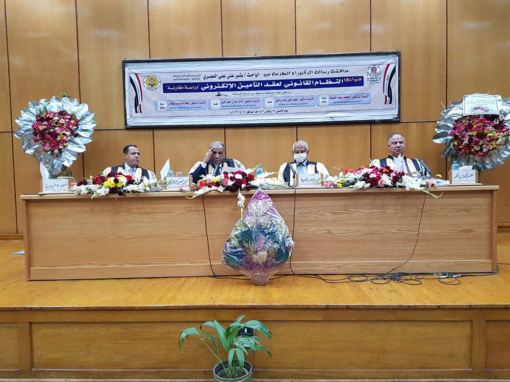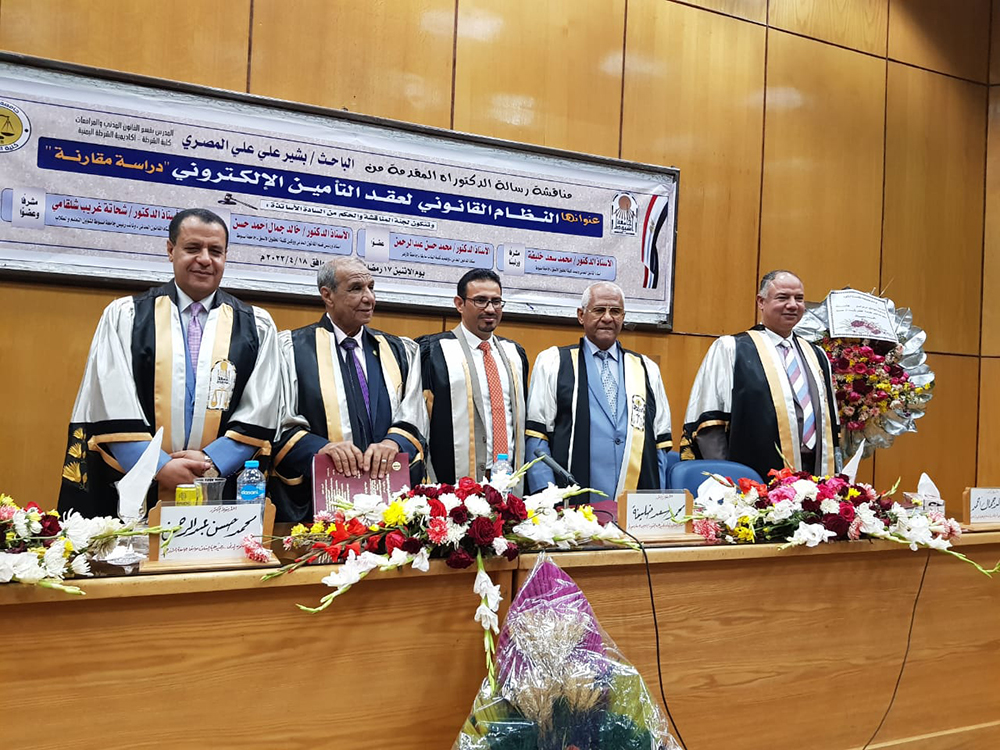 تحت رعاية الدكتور طارق الجمال رئيس جامعة أسيوط , أعلن الدكتور أحمد المنشاوي نائبه لشئون الدراسات العليا والبحوث عن مناقشة رسالة دكتوراه بعنوان " النظام القانوني لعقد التأمين الالكتروني " دراسة مقارنة " للباحث بشير علي علي المصري المدرس بقسم القانون المدني والمرافعات كلية الشرطة أكاديمية الشرطة اليمنية , وتضمنت لجنة المناقشة والحكم من كلا من : الدكتور شحاتة غريب شلقامي استاذ القانون المدني ونائب رئيس الجامعة لشئون التعليم و الطلاب مشرفا وعضوا , والدكتور محمد سعد خليفة أستاذ القانون المدني وعميد كلية الحقوق الأسبق بجامعة أسيوط مشرفا ورئيسا , الدكتور محمد حسن عبد الرحمن أستاذ القانون المدني وعميد كلية البنات سابقا جامعة الأزهر أسيوط عضوا , الدكتور خالد جمال أحمد حسن أستاذ ورئيس قسم القانون المدني ووكيل كلية الحقوق الأسبق جامعة أسيوط عضوا .