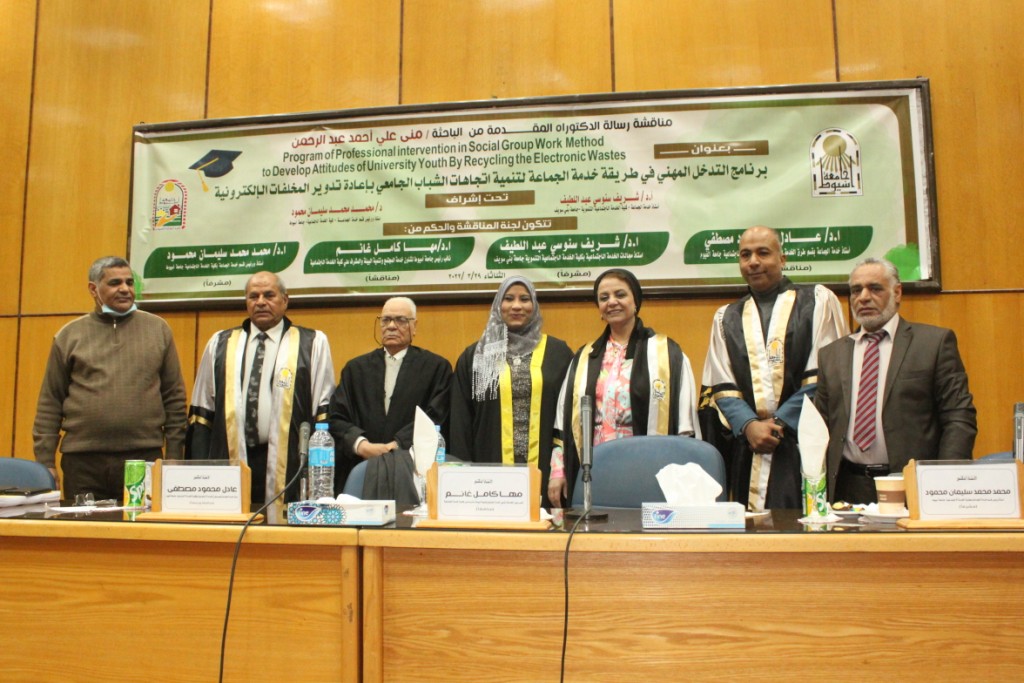 تحت رعاية الدكتور طارق الجمال رئيس جامعة أسيوط أعلن الدكتور أحمد المنشاوي نائب رئيس الجامعة لشئون الدراسات العليا والبحوث عن مناقشة رسالة الدكتوراه بعنوان "برنامج للتدخل المهني في طريقة خدمة الجماعة لتنمية اتجاهات الشباب الجامعي بإعادة تدوير المخلفات الالكترونية " والمقدمة من الباحثة مني علي أحمد و التي تم منح بموجها درجة الدكتوراه مع مرتبة الشرف الأولى, وتكونت لجنة الحكم والمناقشة من الدكتورة مها كامل غانم نائب رئيس الجامعة لشئون خدمة المجتمع وتنمية البيئة والمشرف علي كلية الخدمة الاجتماعية والدكتور عادل محمود مصطفي أستاذ خدمة الجماعة بقسم طرق الخدمة الاجتماعية بكلية الخدمة الاجتماعية جامعة الفيوم والدكتور شريف سنوسي عبد اللطيف أستاذ مجالات الخدمة الاجتماعية التنموية جامعة بني سويف والدكتور محمد محمد سليمان أستاذ ورئيس قسم خدمة الجماعة الاجتماعية جامعة أسيوط.