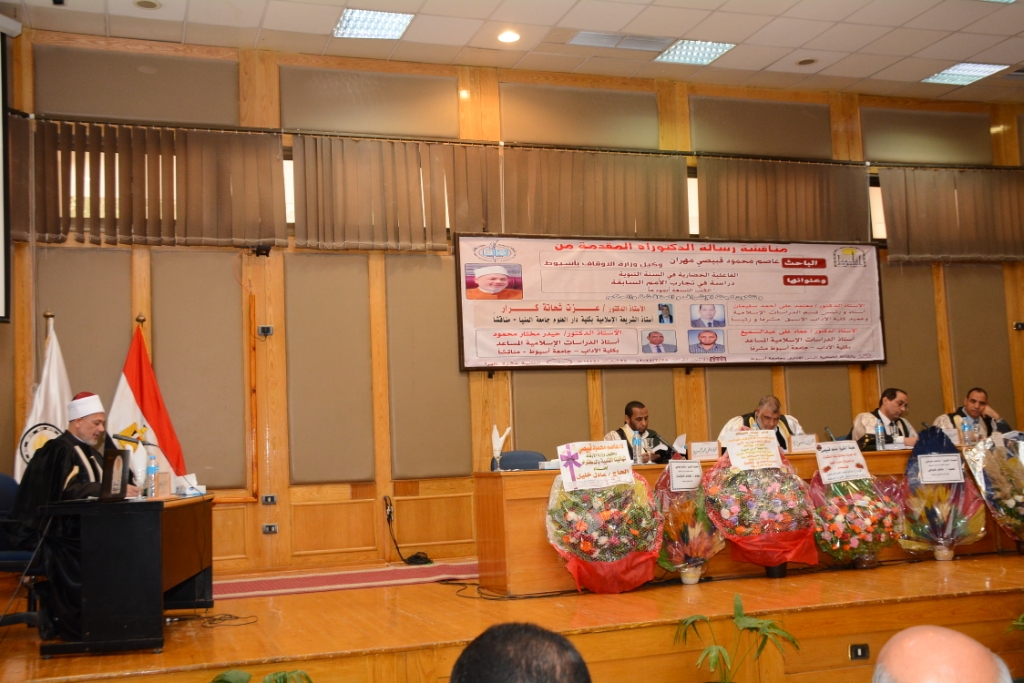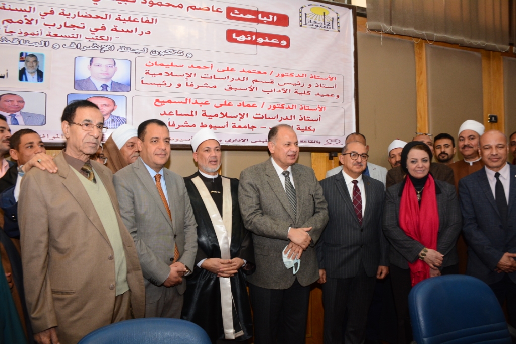 وفي هذا الإطار فقد أعلن الدكتور أحمد المنشاوي نائب رئيس الجامعة لشئون الدراسات العليا والبحوث عن مناقشة رسالة الدكتوراه بعنوان " الفاعلية الحضارية فى السنة النبوية دراسة فى تجارب الامم السابقة "الكتب التسعة انموذجا" والمقدمة من الباحث عاصم محمود قبيصى مهران وكيل وزارة الاوقاف باسيوط و التى تم منح بموجها درجة الدكتوراه مع مرتبة الشرف ,و التى شهدت حضور عصام سعد محافظ اسيوط و الدكتور شحاته غريب نائب رئيس الجامعة لشئون التعليم والطلاب والدكتورة مها كامل غانم نائب رئيس الجامعة لخدمة المجتمع وتنمية البيئة ولفيف من كبار علماء الاوقاف بالمحافظة وتكونت لجنة الحكم والمناقشة من الدكتور معتمد على أحمد سليمان أستاذ ورئيس قسم الدراسات الاسلامية وعميد كلية الآداب الأسبق مشرفا ورئيسا والدكتور عماد على عبد السميع أستاذ الدراسات الاسلامية المساعد بكلية الآداب جامعة أسيوط مشرفا والدكتورعزت شحاته أستاذ الشريعة الاسلامية بكلية دار العلوم جامعة المنبا مناقشا والدكتور حيدر مختار محمود أستاذ الدراسات الاسلامية المساعد بكلية الآداب جامعة أسيوط مناقشا