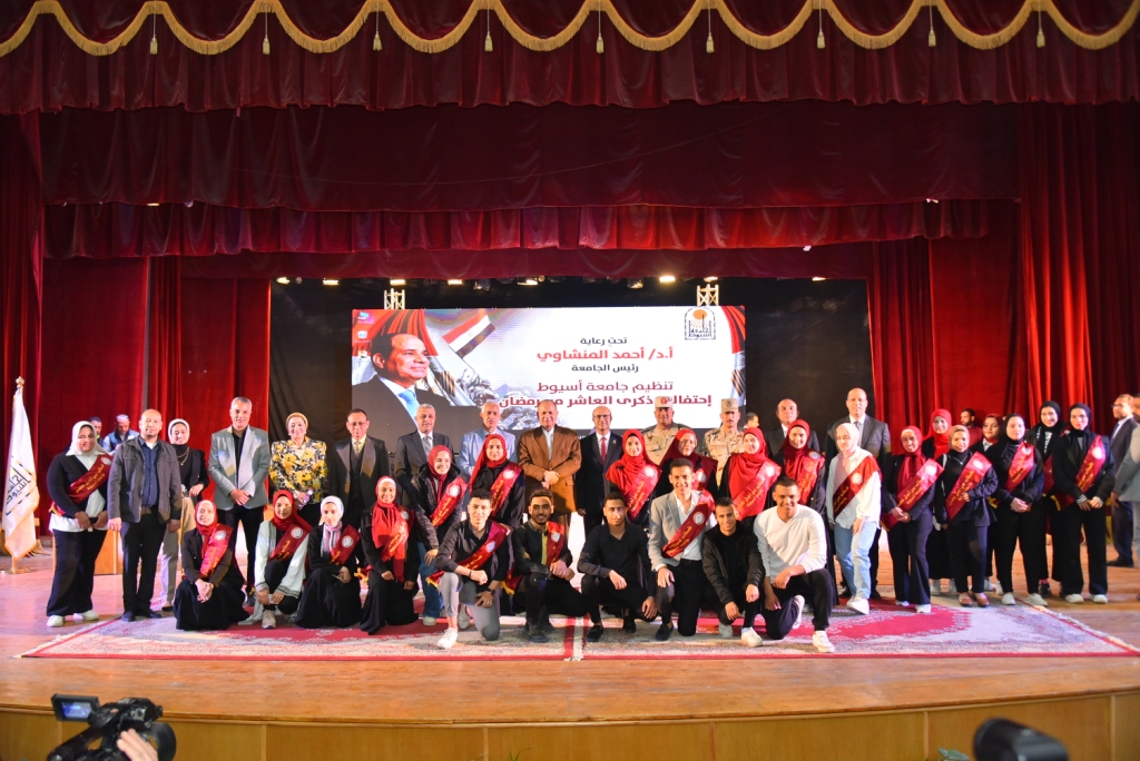نظمت جامعة أسيوط؛ احتفالية كبرى بمناسبة الاحتفال بالذكرى الـ52 لانتصارات العاشر من رمضان، تحت رعاية الدكتور أحمد المنشاوي رئيس الجامعة، وبحضور اللواء عصام سعد محافظ أسيوط، ومساعد رئيس أركان المنطقة الجنوبية العسكرية، وقائد مكتب المخابرات الحربية بأسيوط، ومدير منطقة تجنيد وتعبئة أسيوط، ولفيف من القيادات التنفيذية، والشعبية، والأمنية، والعسكرية، ورجال الدين الإسلامي، و المسيحي، ونواب رئيس الجامعة، وأمين عام الجامعة، ومستشاري رئيس الجامعة، وعمداء الكليات، وأعضاء هيئة التدريس، والقيادات الجامعية، وأعضاء الجهاز الإداري ، والطلاب.