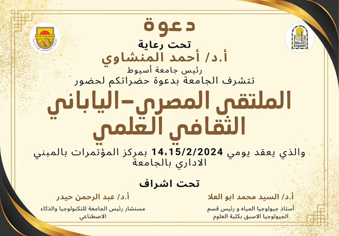 تنظيم جامعة أسيوط، تحت رعاية الدكتور أحمد المنشاوى رئيس جامعة أسيوط؛ الملتقى المصرى - اليابانى الثقافى العلمى؛ وذلك يومى (١٤) و(١٥) فبراير، بحضور سفير دولة اليابان؛ وبمشاركة المؤسسة اليابانية بالقاهرة.