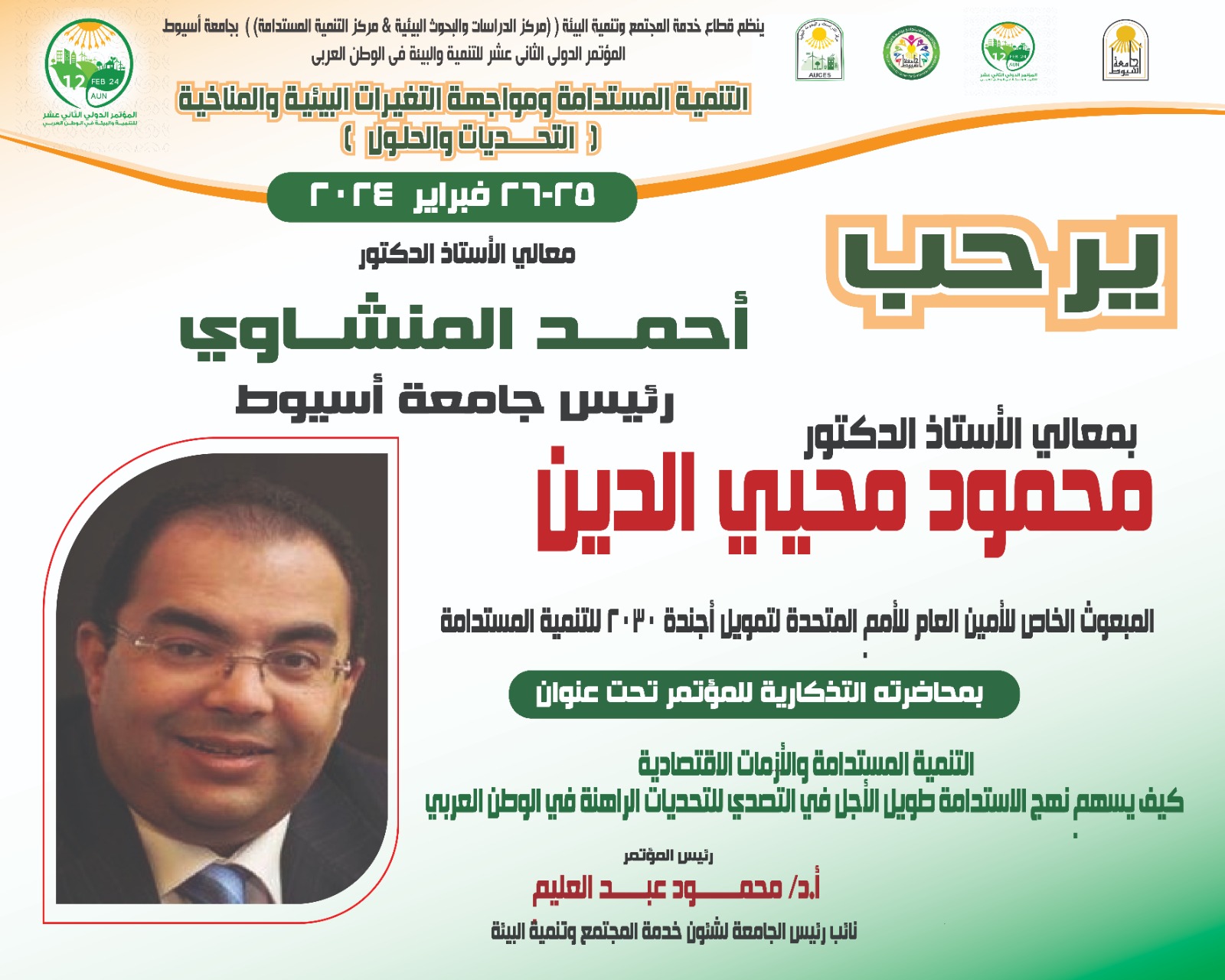تستضيف جامعة أسيوط، غداً الأحد الموافق ٢٥ من فبراير الجاري؛ المحاضرة التذكارية التي يلقيها الدكتور محمود محي الدين المبعوث الخاص للأمين العام للأمم المتحدة لتمويل أجندة ٢٠٣٠ للتنمية المستدامة، حول:"التنمية المستدامة، والأزمات الاقتصادية .. كيف يسهم نهج الاستدامة طويلة الأجل في التصدي؛ للتحديات الراهنة في الوطن العربي"، ضمن فعاليات المؤتمر الدولي الثاني عشر للتنمية، والبيئة في الوطن العربي، تحت رعاية الدكتور محمد أيمن عاشور وزير التعليم العالي والبحث العلمي، والدكتورة ياسمين فؤاد وزيرة البيئة، والدكتور أحمد المنشاوي رئيس الجامعة، واللواء عصام سعد محافظ أسيوط، وإشراف الدكتور محمود عبد العليم نائب رئيس الجامعة لشئون خدمة المجتمع وتنمية البيئة، وتنظيم الدكتور أحمد حمزة الحسيني مدير مركز الدراسات والبحوث البيئية وأمين عام المؤتمر، والدكتور عادل عبده مدير مركز التنمية المستدامة ومقرر المؤتمر، ومشاركة نخبة من المتخصصين، والباحثين، والمهتمين بقضايا البيئة في الوطن العربي؛ من داخل مصر، وخارجها.