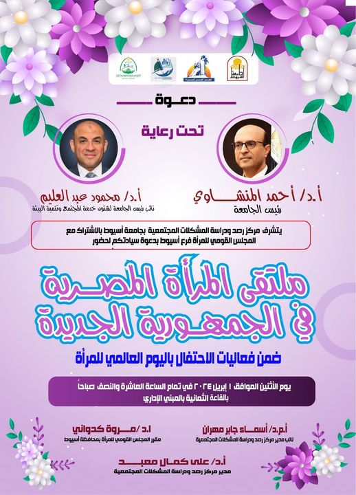تنظم جامعة أسيوط تحت رعاية الدكتور أحمد المنشاوي رئيس الجامعة؛ "ملتقى المرأة المصرية في الجمهورية الجديدة"، ضمن فعاليات الاحتفال باليوم العالمي للمرأة، وذلك يوم الإثنين المقبل الموافق الأول من أبريل ٢٠٢٤، في تمام الساعة العاشرة والنصف صباحاً بالقاعة الثمانية بالمبنى الإداري بالجامعة.