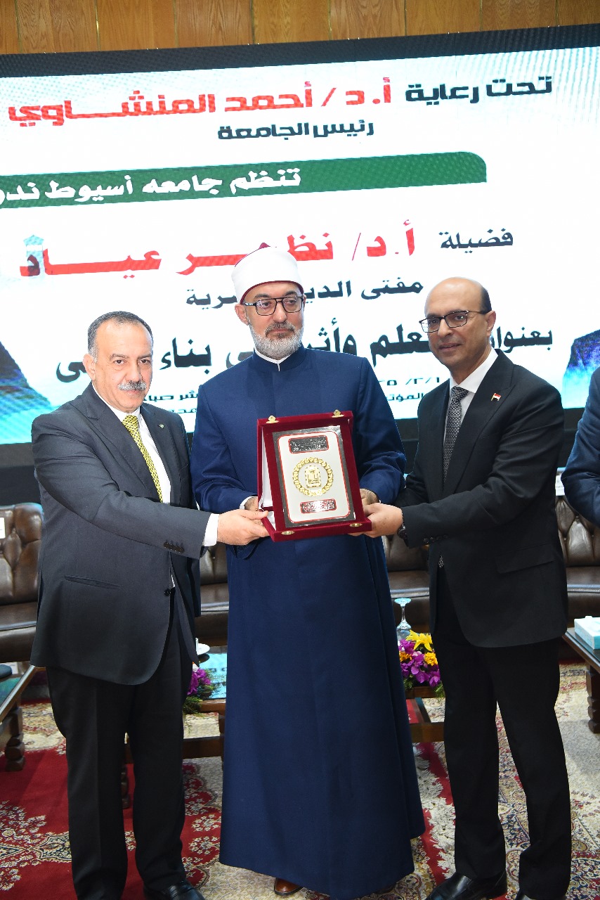 نظمت جامعة أسيوط؛ اليوم الإثنين الموافق 10 من فبراير، تحت رعاية الدكتور أيمن عاشور وزير التعليم العالي والبحث العلمي، والدكتور أحمد المنشاوي رئيس جامعة أسيوط؛ وبحضور اللواء الدكتور هشام أبوالنصر محافظ أسيوط؛ ندوة تثقيفة كبرى، حاضر خلالها فضيلة الدكتور نظير عياد مفتي جمهورية مصر العربية، ورئيس الأمانة العامة لدور وهيئات الإفتاء في العالم، حول " العلم، وأثره في بناء الوعي"، بمشاركة شباب قادة الاتحادات الطلابية من مختلف الجامعات، والمعاهد المصرية، وذلك بهدف التأكيد علي أثر العلم في بناء الوعي، وتطوير الذات، ودوره في تقدم المجتمع وتطوره، ورفعة شأن أفراده.