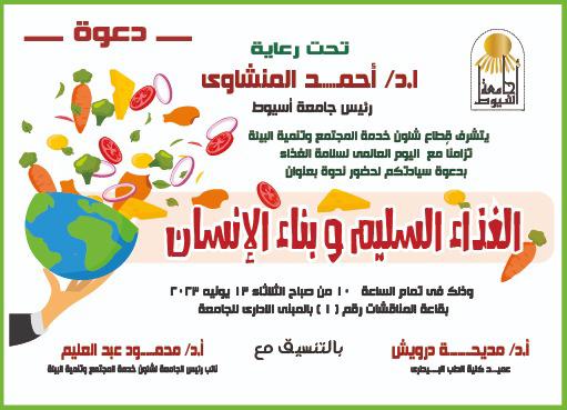 تنظم جامعة أسيوط، الثلاثاء القادم 13 من يونيو الجاري، ندوة توعوية بعنوان: " الغذاء السليم وبناء الإنسان"، والتي ينظمها قطاع شئون خدمة المجتمع وتنمية البيئة، وذلك تحت رعاية الدكتور أحمد المنشاوي رئيس جامعة أسيوط، وبإشراف من الدكتور محمود عبد العليم القائم بعمل نائب رئيس الجامعة لشئون خدمة المجتمع وتنمية البيئة، والدكتورة مديحة درويش عميد كلية الطب البيطري.