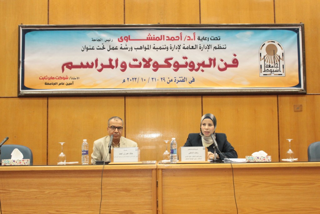 تحت رعاية الدكتور أحمد المنشاوى رئيس جامعة أسيوط ، نظمت الإدارة العامة، لإدارة وتنمية المواهب بالجامعة ، ورشة عمل حول: " فن البروتوكولات والمراسم " ، والممتدة فى الفترة من 29 إلى 31 من أكتوبر الجارى ، بإشراف الأستاذ شوكت صابر أمين عام الجامعة ، والأستاذ مصطفى حسن أمين الجامعة المساعد ، والأستاذ محمود يونس رئيس الإدارة المركزية للموارد البشرية ، والأستاذ خالد عمران مدير عام الإدارة العامة لإدارة وتنمية المواهب ، وبمشاركة (60) من الموظفين بإدارات العلاقات العامة فى المبنى الإدارى ، والكليات المختلفة بالجامعة ، والمدن الجامعية ، والمستشفيات الجامعية.