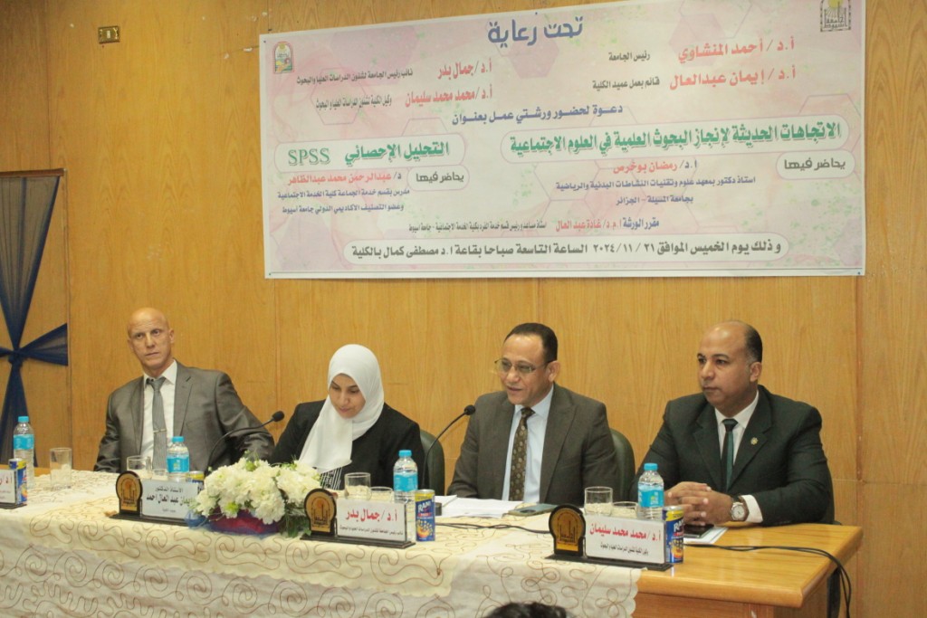 استهدفت ورشة العمل؛ تسليط الضوء على؛ الإتجاهات العلمية الحديثة لإنجاز البحوث العلمية في العلوم الاجتماعية، والتحليل الإحصائي SPSS، وذلك من خلال؛ مناقشات علمية مثمرة، علي يد متخصصين في هذا المجال.