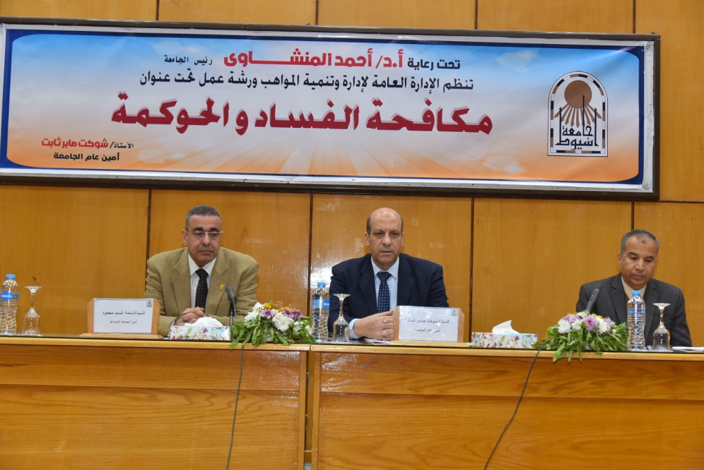 وأوضح الأستاذ خالد عمران أن الورشة تتناول، عدداً من الموضوعات المهمة لثلاثة محاضرين، وهم: الدكتور محمد محمد سليمان وكيل كلية الخدمة الاجتماعية لشئون خدمة المجتمع وتنمية البيئة، والذي تحدث عن: الاتفاقية الدولية لمكافحة الفساد- الاستراتيجية الوطنية لمكافحة الفساد، ومحاضرة للدكتور دويب حسين صابر عميد كلية الحقوق حول: الإطار التشريعي والمؤسسي لمكافحة الفساد في مصر، سلوك وأخلاق الوظيفة العامة وفقاً للمادة (٥٧) من قانون الخدمة المدنية رقم ٨١ لسنة ٢٠١٦م ، عقوبة مرتكبي أعمال الفساد الاداري، وأخرى للدكتورة نسمة عصمت محمد بقسم علم النفس كلية الآداب، وتناقش فيها: العلاج بالصدمة لمكافحة الفساد.