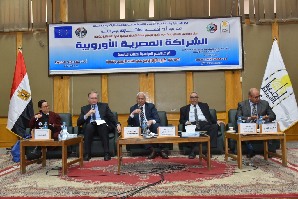عقدت جامعة أسيوط، تحت رعاية الدكتور أحمد المنشاوي رئيس جامعة أسيوط؛ اليوم الثلاثاء الموافق ٢٧ فبراير، مع وفد الاتحاد الأوروبي، حلقة نقاشية بعنوان" الشراكة المصرية الأوروبية-فرص المنح الدراسية لطلاب الجامعة"، بمشاركة السفير كريستيان برجر سفير الإتحاد الأوروبي بالقاهرة، والسيدة انطونيا زفارى رئيس قسم الشئون السياسية والاقتصاد والتجارة والمعلومات بالإتحاد، وبحضور السيدة مارلينا جيورجيادو، والسيد دانيال كولمان منسق أنشطة الاتحاد الأوروبي بالجامعة، وإشراف الدكتور أحمد عبدالمولى نائب رئيس الجامعة لشئون التعليم والطلاب، والدكتور علاء عبدالحفيظ عميد كلية التجارة، والدكتور محمد عدوي مدير مركز دراسات المستقبل بالجامعة.