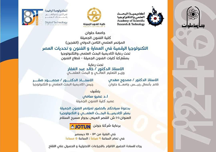 تحت رعاية الدكتور طارق الجمال رئيس جامعة أسيوط ، أعلن الدكتور احمد المنشاوي نائب رئيس الجامعة لشئون الدراسات العليا والبحوث والمشرف على كلية الفنون الجميلة عن إنابته للدكتور محمد حلمي الحفناوى وكيل كلية الفنون الجميلة ورئيس قسم العمارة بالكلية للمشاركة في فعاليات المؤتمر الدولي الثامن والذي نظمته كلية الفنون الجميلة بجامعة حلوان بالتعاون مع أكاديمية البحث العلمي ،في الفترة من 13 إلى 15 من ديسمبر الجاري تحت عنوان " التكنولوجيا الرقمية في العمارة والفنون وتحديات العصر " وذلك برعاية الدكتور خالد عبد الغفار وزير التعليم العالي والبحث العلمي ،والدكتور محمود صقر، رئيس أكاديمية البحث العلمي والتكنولوجيا، والدكتور ممدوح مهدي، القائم بعمل رئيس جامعة حلوان، والدكتور عمرو سامي، عميد كلية الفنون الجميلة جامعة حلوان ورئيس المؤتمر، وبحضور الدكتور عمرو سامي عميد كلية الفنون الجميلة بحلوان ، وشهد المؤتمر مشاركة نخبة من عمداء وأساتذة كليات الفنون الجميلة من عدد من الجامعات المصرية ، فضلاً عن مشاركة دولية متميزة من مجموعة مختارة من أساتذة الفنون والهندسة المعمارية الدولية والإقليمية من أمريكا وإنجلترا وإيطاليا وفرنسا وإندونيسيا والعراق ولبنان والأردن والكويت.