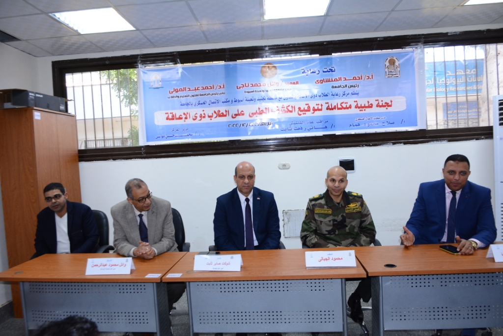 تحت رعاية الدكتور أحمد المنشاوي القائم بعمل رئيس جامعة أسيوط، والعميد وائل محمد ناجى مدير منطقة تجنيد وتعبئة أسيوط، عقد مركز رعاية الطلاب ذوى الهمم بالتعاون مع منطقة تجنيد و تعبئة أسيوط اللجنة الطبية المتكاملة لتوقيع الكشف الطبي على الطلاب من ذوى الهمم لتحديد موقفهم من التجنيد ومنح المستحقين شهادات الإعفاء من التجنيد، وذلك بحضور الدكتور أحمد عبد المولى القائم بعمل نائب رئيس الجامعة لشئون التعليم والطلاب، والدكتور محمد حسين موسى مدير المركز، و أعضاء اللجنة الطبية برئاسة المقدم محمود الجبالي، والنقيب مصطفى كامل، والنقيب أحمد فيصل، والأستاذ شوكت صابر أمين عام الجامعة، والأستاذ وائل محمود أمين الجامعة المساعد والأستاذ هاني رفعت مفتش عام التجنيد ، والأستاذ صلاح همام مدير مكتب الاتصال العسكري بالجامعة.