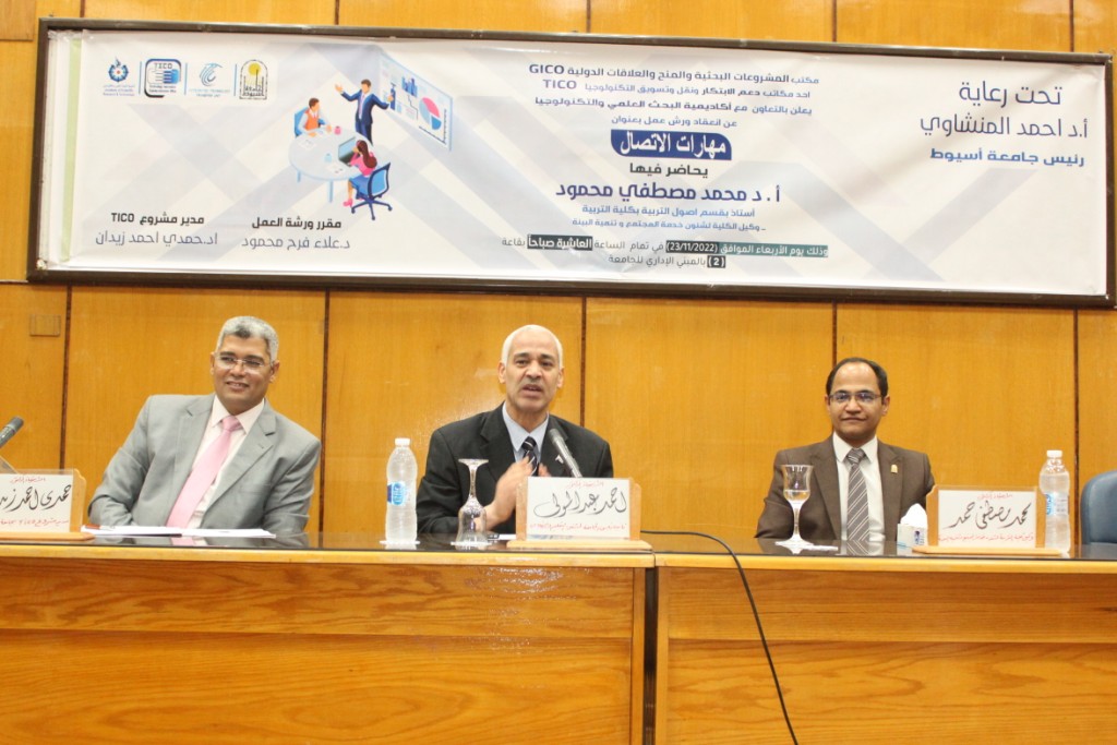 تحت رعاية الدكتور أحمد المنشاوي القائم بعمل رئيس جامعة أسيوط، شهدت الجامعة انعقاد ورشة عمل بعنوان "مهارات الاتصال الفعال"، وذلك ضمن سلسلة ورش العمل الذى يعقدها مكتب الملكية الفكرية وبراءات الاختراع أحد مكاتب دعم الابتكار ونقل وتسويق التكنولوجيا بجامعة اسيوط بتمويل من أكاديمية البحث العلمي والتكنولوجيا، وبحضور الدكتور أحمد عبد المولى نائب رئيس الجامعة لشئون التعليم والطلاب والدكتور حمدى زيدان مدير وحده نقل التكنولوجيا المتكاملة ITTU ومدير مكتب التايكو TICO بجامعة اسيوط و نخبة من عمداء ووكلاء الكليات ولفيف من أعضاء هيئة التدريس ومعاونيهم، وحاضر فيها الدكتور محمد مصطفى حمد أستاذ أصول التربية ووكيل كلية التربية لشئون خدمة المجتمع وتنمية البيئة.