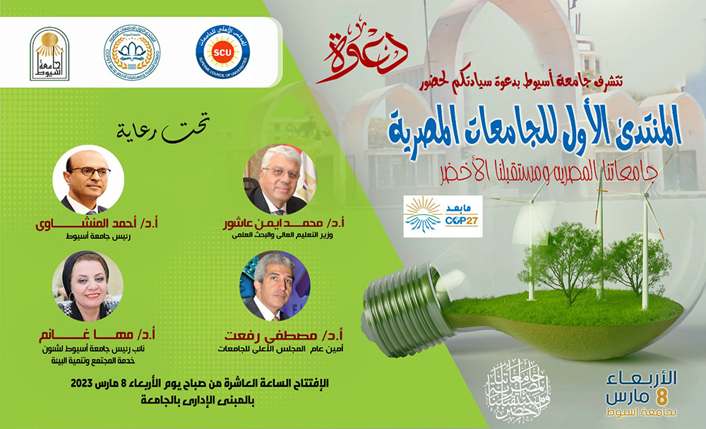 أعلن الدكتور أحمد المنشاوى رئيس جامعة أسيوط عن إطلاقه الأربعاء 8/3/2023 المنتدى الأول للجامعات المصرية تحت عنوان "جامعتنا المصرية ومستقبلنا الأخضر بعد "COP27 تحت رعاية معالى الوزير الدكتور محمد أيمن عاشور وزير التعليم العالى والبحث العلمى وذلك بحضور الدكتور مصطفى رفعت أمين المجلس الأعلى للجامعات، والدكتورة مها غانم نائب رئيس الجامعة لشئون خدمة المجتمع وتنمية البيئة ورئيس المؤتمر، والدكتور محمود صقر رئيس أكاديمية البحث العلمي والتكنولوجيا، وبمشاركة كوكبة من أعضاء المجلس الأعلى للجامعات لشئون خدمة المجتمع وتنمية البيئة والذي يضم مجموعة من رؤساء الجامعات ونوابهم لشئون القطاع المختص، فضلاً عن عمداء كليات جامعة أسيوط ووكلائها وأساتذتها وقيادات الجامعة الإدارية.
