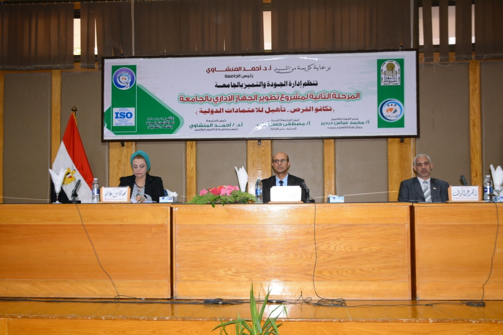 جاء ذلك فى مستهل كلمته خلال مشاركته احتفال الجامعة بانطلاق المرحلة الثانية من مشروع تطوير الجهاز الإدارى بالجامعة والذى نظمته إدارة الجودة والتميز بالجامعة بعنوان " تكافؤ الفرص والتأهيل للاعتمادات الدولية" ، و ذلك بحضور الدكتورة مها غانم نائب رئيس الجامعة لشئون خدمة المجمتع و تنمية البيئة ، و الدكتور أحمد عبدالمولى القائم بعمل نائب رئيس الجامعة لشئون التعليم و الطلاب ، و الأستاذ مصطفى حسن أمين عام الجامعة المساعد و المشرف على إدارة الجودة و التميز، و الاستاذ محمد عباس ممثل الادارة العليا للجودة و التميز ، و لفيف من السادة عمداء و وكلاء الكليات و القيادات الإدارية بالجامعة و العاملين بمختلف القطاعات والكليات .