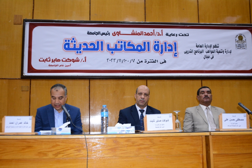 جاء ذلك تعقيباً على انعقاد البرنامج التدريبى فى مجال ادارة المكاتب الحديثة ، بحضور الاستاذ شوكت صابر ثابت امين الجامعة والاستاذ مصطفى حسن أمين الجامعة المساعد، و الاستاذ خالد عمران مدير عام ادارة وتنمية المواهب وبحضور عدد كبير من موظفي المبنى الإداري والكليات بالجامعة.