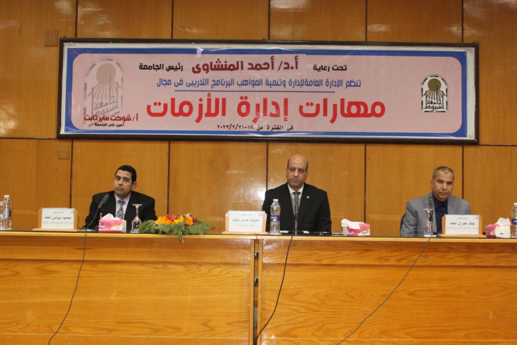 جاء ذلك تعقيباً على انعقاد الدورة التدريبية فى مجال مهارات ادارة الازمات ، بحضور الاستاذ شوكت صابر ثابت وكيل اول الوزارة وامين عام الجامعة ، و الاستاذ محمود يونس احمد رئيس الادارة المركزية للموارد البشرية ,والاستاذ خالد عمران مدير عام الادارة العامة لادارة وتنمية المواهب وبحضور عدد كبير من موظفي المبنى الإداري والكليات بالجامعة.