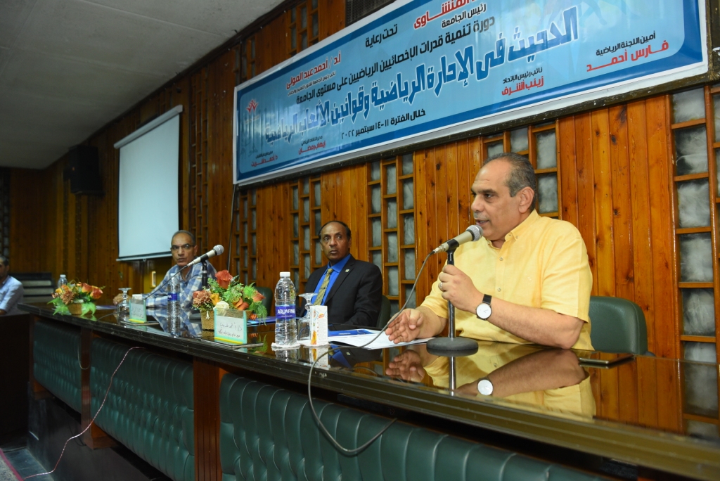 اعلن الدكتور احمد المنشاوى القائم بعمل رئيس جامعة اسيوط عن انطلاق فاعليات دورة تنمية قدرات الاخصائيين الرياضيين تحت عنوان "الحديث فى الادارة الرياضية و قوانين الالعاب الرياضية" والتي تنظمها الادارة العامة لرعاية الشباب تحت إشراف الدكتور أحمد عبد المولى القائم بعمل نائب رئيس الجامعة لشئون التعليم والطلاب، وذلك بحضور الدكتور جمال محمد على عميد كلية التربية الرياضية الاسبق ومدير ادارة المدربين بالاتحاد المصرى لكرة القدم , الدكتور طارق محمد عبد العزيز عميد كلية التربية الرياضية الاسبق وعضو ادارة الاتحاد الاتحاد الرياضى للجامعات, الدكتور محمد مصطفى حمد وكيل كلية التربية لشئون خدمة المجتمع وتنمية البيئة , الدكتور ابراهيم حسين , والدكتور احمد شريت مديرعام رعاية الشباب، الكابتن حمدى القاضى عضو لجنه الحكام بالاتحاد المصرى لكرة القدم ,الكابتن شارل اليشع شكرى ,الكابتن وائل حماده صلاح ,الكابتن عمر عبد الحميد احمد ,الكابتن جمال حسن رجب ,الكابتن عماد راغب سيدهم والكابتن محمود شعبان قنديل.