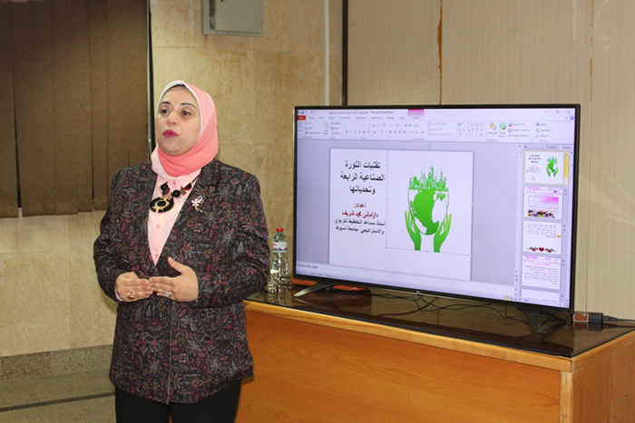 وخلال محاضرتها أستعرضت الدكتورة أماني شريف عدد من المحاور الرئيسية حول الارتقاء بجودة التعليم الجامعي في ضوء تحديات الثورة الصناعية الرابعة وتحدياتها و تطبيقاتها و تأثيراتها على المنظومة الجامعية و دور التعليم الجامعي في التصدي لتلك التحديات و كذلك عرض ايجابيات التحول التكنولوجي الرقمي على التعليم الجامعي و متطلبات الجودة التي تتبنها جامعة أسيوط ، كما استعرضت أيضاً بعض تطبيقات الثورة الصناعية الرابعة في التعليم العالي و إلى جانب تحدياتها و التي تضمنت إيجاد سياسات جديدة" التعلم عن بعد _التعلم مدى الحياة "و التي تتيح التعليم للجميع باستخدام التكنولوجيا و تأهيل كوادر بشرية قادرة على التعامل مع تكنولوجيا العصر الرقمي مع تغير حجم و نوعية الوظائف نظرا لان المهارات الرقمية المطلوبة تختلف عن المهام الحالية وكذلك زيادة الوعي الاجتماعي بالتفاعلات الالكترونية و الترابط الشبكي للجامعات عبر الانترنت و صانعتها للقرار فى ظل التنافسية العالمية و زيادة التعاون الاقتصادي بين الجامعات و توظيف التكنولوجيا الحديثة و تطبيقاتها فى النظام التعليمي و الانفتاح على المنتجات التقنية الجديدة .
