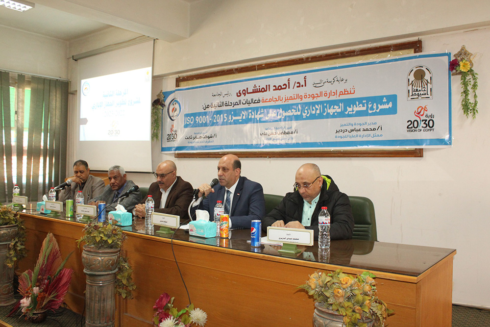 وأشار الأستاذ شوكت صابر إلى حرص إدارة الجامعة على نشر ثقافة الجودة والتميز بين العاملين بجهازها الإداري، حيث أن جامعة أسيوط مؤسسة تعليمية ذات كيان وقيمة تبنت مفاهيم ومواصفات قياسية لجودة النظام الإداري وذلك لتطبيق المعايير والمواصفات القياسية العالمية المعنية بالجودة، وكذلك تحقيق أهداف التنمية والوصول إلى الموارد والخدمات دون تميز لكافة الفئات وتعزيز قيم الولاء والانتماء للجامعة والذي يساهم في إخراج كافة المهارات الإبداعية والابتكارية لدى العاملين بالجهاز الإداري والذي يعود بالنفع على كافة قطاعات الجامعة.