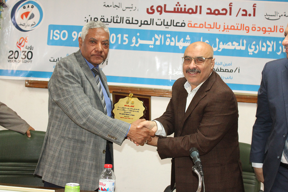وأوضح الأستاذ محمد عباس أن الهدف من الجودة والتميز هو دفع وتعزيز عمليات التطوير وصقل مهارات العاملين بالجامعة، وإدخال آليات عمل جديدة لتحسين الأداء، والتركيز على إرضاء العميل الداخلي والخارجي، وتحسين الصورة الذهنية لمقدمي الخدمة، والوفاء بمعايير المواصفات القياسية المعترف بها في السوق المحلي والأسواق الدولية (الأيزو 9001:2005).