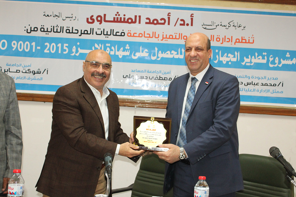 جاء ذلك في إطار إعلان سيادته عن بدء الزيارات الميدانية لكليات الجامعة المستهدفة للتأهيل ضمن فاعليات المرحلة الثانية من مشروع تطوير وتأهيل الجهاز الإداري، وذلك تحت إشراف الأستاذ شوكت صابر أمين الجامعة والمشرف العام على الجودة والأستاذ مصطفى حسن أمين الجامعة المساعد ونائب رئيس مجلس إدارة الجودة والتميز، وبحضور الدكتور عماد سمير عميد كلية التربية الرياضية، والدكتور عادل محمد محمود عميد كلية الزراعة، والأستاذ حمدي أحمد العدوي أمين الكلية، والأستاذ محمد عباس مدير إدارة الجودة والتميز وممثل الإدارة العليا للجودة والتميز، ولفيف من القيادات الإدارية بالجامعة والعاملين بمختلف القطاعات والكلية.