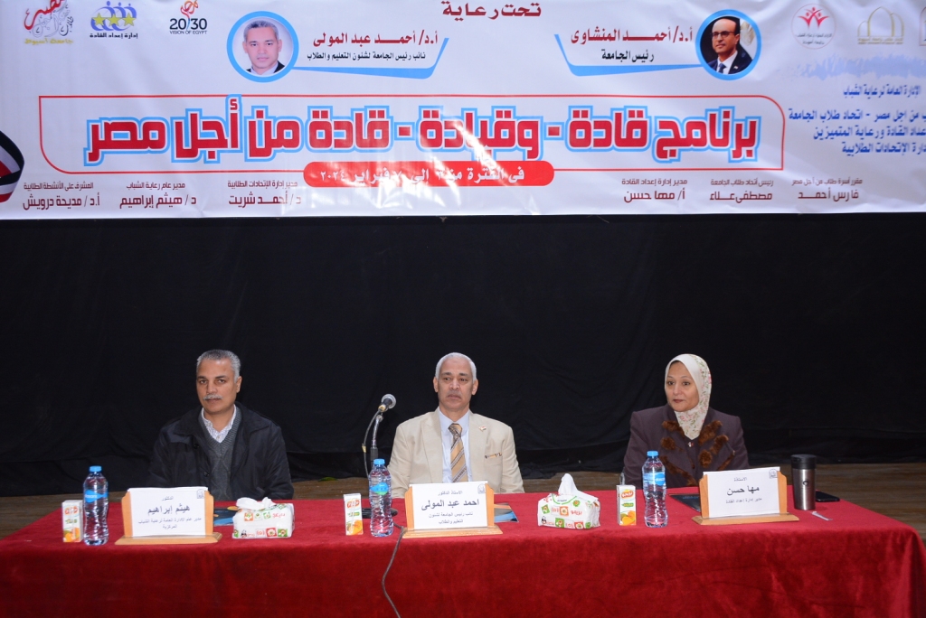 تحت رعاية الدكتور أحمد المنشاوي رئيس جامعة أسيوط، وبإشراف أحمد عبد المولي نائب رئيس الجامعة لشئون التعليم والطلاب، والدكتورة مديحة درويش المشرف العام علي الأنشطة الطلابية، نظمت إدارة الاتحاد الطلابي، وإدارة اعداد القادة وأسرة طلاب من أجل مصر، فعاليات برنامج قادة- وقيادة- قادة من أجل مصر، التي تقام خلال فترة إجازة نصف العام، في الفترة من ٣ وحتي ٧ من فبراير .