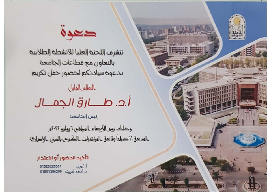 تشهد جامعة أسيوط صباح غداً الأربعاء 6 يوليو 2022 حفل موسع لتكريم العالم الجليل الدكتور طارق الجمال رئيس الجامعة والمقام بقاعة الدكتور محمد رأفت محمود الكبرى للمؤتمرات بالمبنى الإدارى وذلك بحضور اللواء عصام سعد محافظ أسيوط ، واللواء أركان حرب محب حبشى قائد المنطقة الجنوبية العسكرية والسادة نواب رئيس الجامعة لمختلف القطاعات وعمداء كليات الجامعة النظرية والعملية وقيادات العمل الإدارى بالإضافة إلى الحضور الكريم من القيادات التنفيذية والأمنية والشعبية والقيادات الدينية ورجال الإعلام وطلاب الجامعة .
