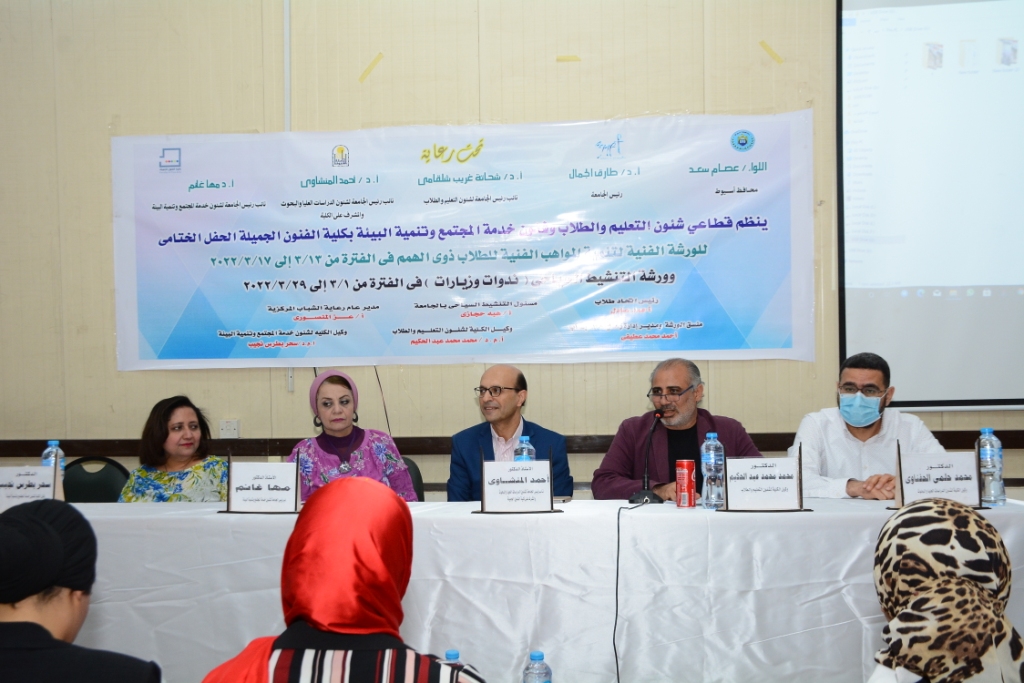 شهدت جامعة أسيوط حفل ختام الورشة الفنية لتنمية المواهب الفنية لطلاب ذوى الهمم و ورشة التنشيط السياحي "ندوات و زيارات " و الذي نظمه قطاعي شئون التعليم و الطلاب وخدمة المجتمع وتنمية البيئة بكلية الفنون الجميلة و ذلك تحت رعاية اللواء عصام سعد محافظ أسيوط ، والدكتور طارق الجمال رئيس جامعة أسيوط ، و بحضور الدكتور أحمد المنشاوي نائب رئيس الجامعة لشئون الدراسات العليا و البحوث و المشرف على كلية الفنون الجميلة ، و الدكتورة مها غانم نائب رئيس الجامعة لشئون خدمة المجتمع و تنمية البيئة ، و الدكتور محمد عبد الحكيم وكيل الكلية لشئون التعليم و الطلاب ، و الدكتورة سحر بطرس وكيل الكلية لشئون خدمة المجتمع و تنمية البيئة ، و الدكتور محمد حلمي وكيل الكلية لشئون الدراسات العليا و البحوث ، والدكتور سامح البنا رئيس قسم الآثار بكلية الآداب ،والدكتورة رحاب أحمد زكى مستشار ذوى الإعاقة باللجنة العلية بالأنشطة الطلابية بالجامعة و لفيف من رؤساء الأقسام و أعضاء هيئة التدريس و معاونيهم بكلية الفنون الجميلة و من مختلف كليات الجامعة و مسئولي التنشيط السياحي بالجامعة و بمشاركة الجمعية النسائية و الجمعية المصرية لذوى الإعاقة السمعية و مركز رعاية الطلاب ذوى الإعاقة بالجامعة .