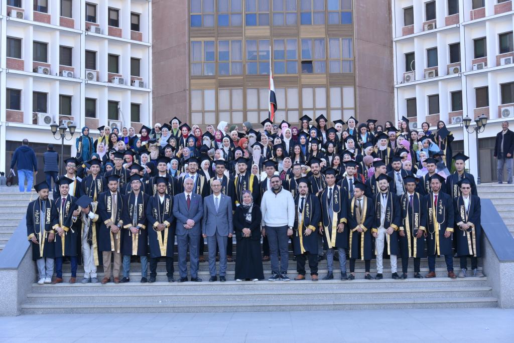 وقد شهد الحفل تكريم الدكتور أحمد عبد المولي نائب رئيس الجامعة، كما شهد تكريم الطلاب الأوائل على الدفعة.