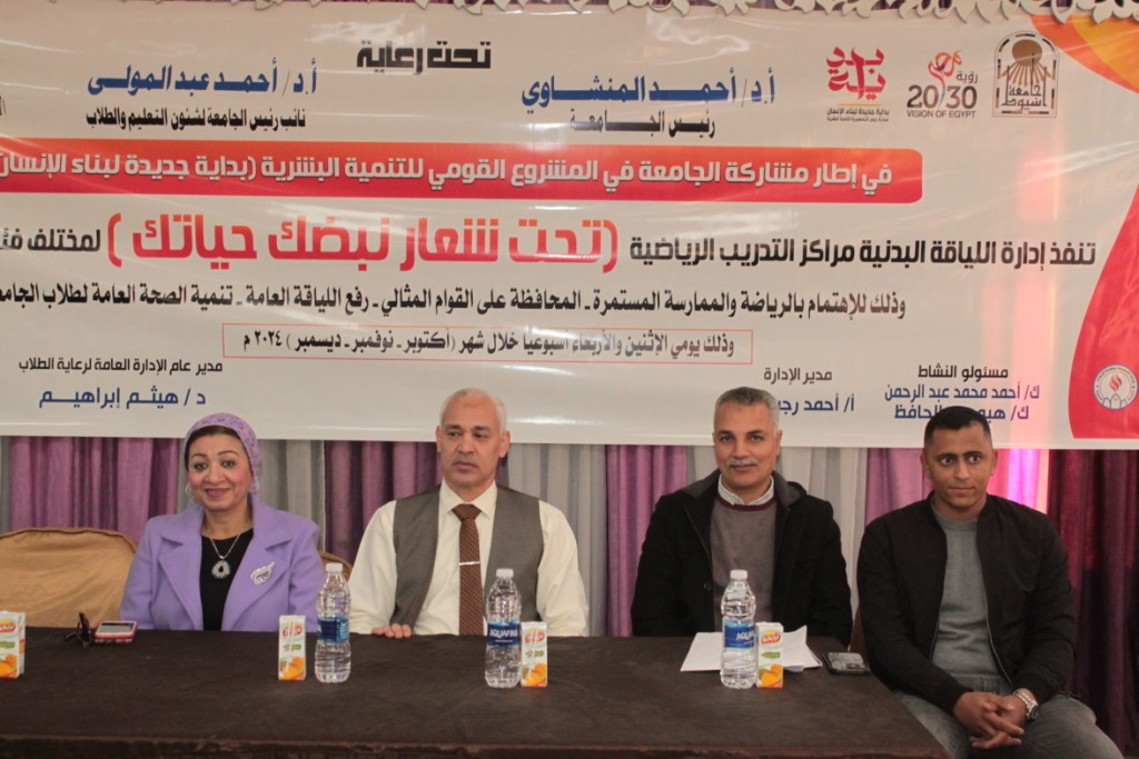 تحت رعاية الدكتور أحمد المنشاوى رئيس جامعة أسيوط، اختتمت إدارة اللياقة البدنية بالإدارة العامة لرعاية الطلاب؛ فاعليات مبادرة "نبضك حياتك" لطلاب وطالبات كليات الجامعة، والمدن الجامعية، والتى نظمتها الإدارة بمراكز التدريب الرياضية، خلال الأشهر؛ أكتوبر، ونوفمبر، وديسمبر ٢٠٢٤، وذلك تحت إشراف؛ الدكتور أحمد عبد المولى نائب رئيس الجامعة لشئون التعليم والطلاب، والدكتورة مديحة درويش المشرف العام على الأنشطة الطلابية، والدكتور هيثم إبراهيم مدير عام الإدارة العامة لرعاية الطلاب.