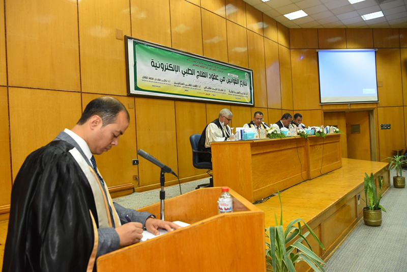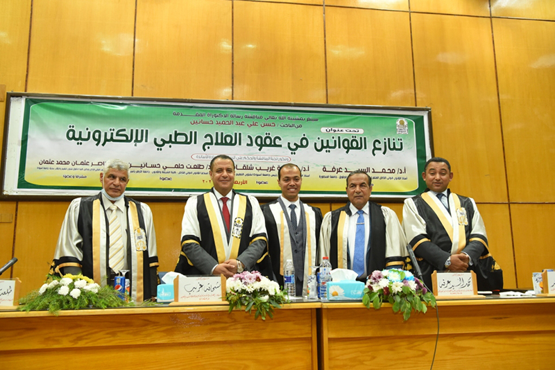 تحت رعاية الدكتور طارق الجمال رئيس جامعة أسيوط أعلن الدكتور أحمد المنشاوي نائب رئيس الجامعة لشئون الدراسات العليا والبحوث عن مناقشة رسالة دكتوراه في القانون الدولي الخاص تحت عنوان "تنازع القوانين في عقود العلاج الطبية الإلكترونية"، للباحث حسن علي عبد الحميد حسانين، حيث تم منحه درجة الدكتوراه في القانون بتقدير جيد جداً.
