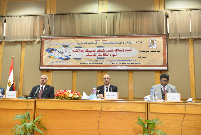 جاء ذلك تعقيباً على انعقاد ندوة بعنوان آليات وقواعد عمل لجان الترقيات وفقاً لأحكام الدورة الثالثة عشر للترقيات إلى وظيفة أستاذ وأستاذ مساعد، بحضور الدكتور أحمد المنشاوي نائب رئيس الجامعة لشئون الدراسات العليا والبحوث، والدكتورة مها غانم نائب رئيس الجامعة لشئون خدمة المجتمع وتنمية البيئة، والدكتور أحمد عبد المولى عضو لجنة ترقيات العقاقير وعميد كلية الصيدلة، والدكتور عثمان عبد القادر رئيس قسم قانون المرافعات بكلية الحقوق ومنسق الندوة، ولفيف من عمداء كليات الجامعة ووكلائها ونخبة من أعضاء هيئة التدريس.