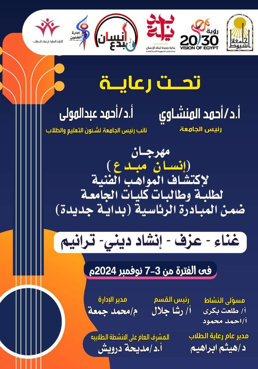 تحت رعاية الدكتور أحمد المنشاوي رئيس جامعة أسيوط، تنظم إدارة الفنون بالإدارة العامة لرعاية الطلاب؛ مهرجان"إنسان مبدع" ؛لاكتشاف المواهب الفنية في مجالات:العزف، و الغناء، والإنشاد الديني، و الترانيم؛ لطلبة، وطالبات الجامعة، خلال الفترة من 3 نوفمبر، وحتى 7 نوفمبر، وذلك بالمسرح المكشوف بالبهو الرئيس) بالقرية الأولمبية بالجامعة.