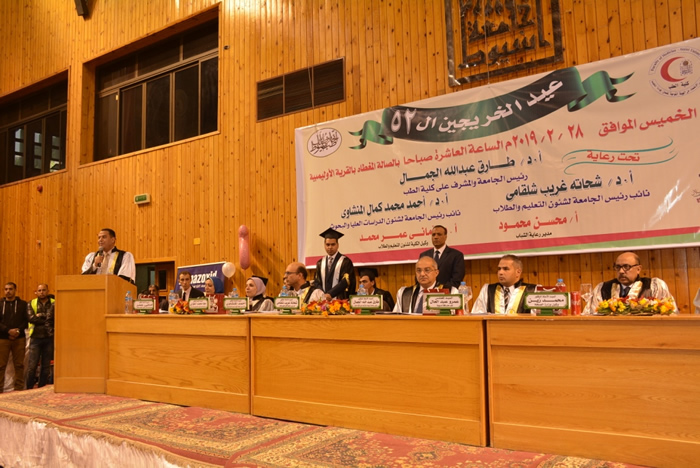 وفى بداية كلمته تقدم الدكتور طارق الجمال بالتهنئة للخريجين من دفعة 52 من طلاب وطالبات كلية الطب والذين تفخر بهم الجامعة دوماً وعلى مدار عقودها الطويلة ، كما أوصى الطلاب من الخريجين بضرورة أن يكونوا أمناء على المرضى وحسن المعاملة القائمة على الرحمة والإنسانية ، وحذرهم من الانسياق وراء الأهداف المادية التي لا تمت لمهنة الطب بصلة ،مؤكداً أن الطب مهنة سامية تنأى عن كل ما هو مادى ، كما دعا الطلاب إلى زيادة البحث العلمي والاضطلاع ومواكبة كل ما هو جديد فى شتى التخصصات الطبية وأن يصلوا أساتذتهم من أعضاء هيئة التدريس والذين لم يألوا جهداً فى إبداء النصح لهم ومواصلة تدريبهم وتعليمهم ليخطوا أولى خطواتهم العملية على أرض الواقع.