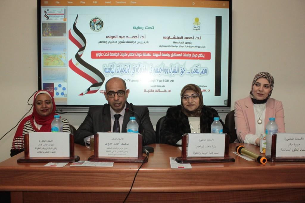 تحت رعاية الدكتور أحمد المنشاوي رئيس جامعة أسيوط، نظم مركز دراسات المستقبل، اليوم الثلاثاء ٥ من ديسمبر ، ندوة توعوية تحت عنوان "مصر تنتخب .. حق الشباب وواجبهم في المشاركة في الانتخابات الرئاسية"، بكليات: الصيدلة، والهندسة، والطب البيطري، والتربية النوعية، والتربية للطفولة المبكرة، والتمريض.