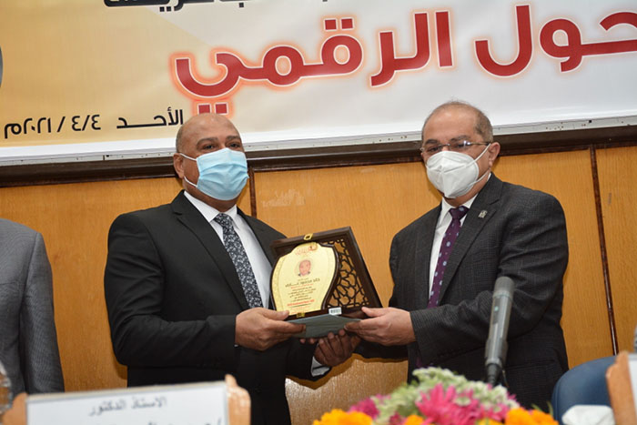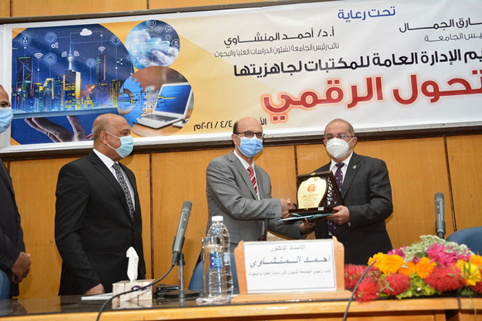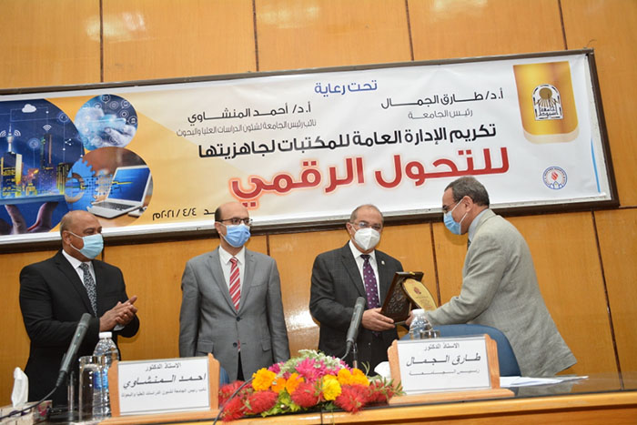 جاء ذلك خلال حضوره احتفال الجامعة صباح اليوم بإعلان جاهزية مكتباتها الجامعية للتحول الرقمي وتكريم الأخصائيين المتميزين من العاملين بقطاع المكتبات , وذلك بحضور الدكتور أحمد المنشاوي نائب رئيس الجامعة لشئون الدراسات العليا والبحوث والذي يتبعه الإدارة العامة لشئون مكتبات الجامعة , والدكتور خالد محمود عارف مدير عام المكتبات الجامعية , والدكتور طارق كمال عبد الحميد مدير مشروع ميكنة المكتبات , والدكتور محمد أحمد ثابت أستاذ المكتبات والمعلومات المساعد بكلية الآداب بالجامعة , وبمشاركة لفيف متميز من العاملين بقطاع المكتبات الجامعية .