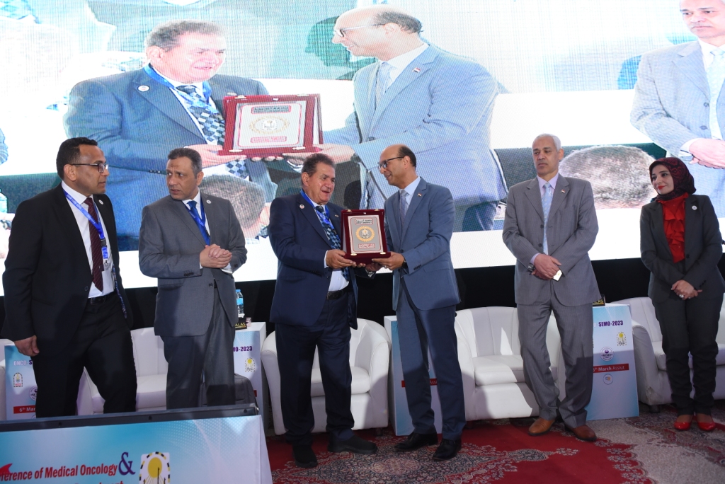 وفي الختام تقدم الدكتور أحمد المنشاوي رئيس جامعة أسيوط بتقديم درع جامعة أسيوط تقديراً وعرفاناً بالجميل للدكتور محمد شلبي نائب رئيس الجامعة الأسبق ومؤسس معهد جنوب مصر الأورام لما له من بصمات واضحة في إنجاح المنظومة الطبية .
