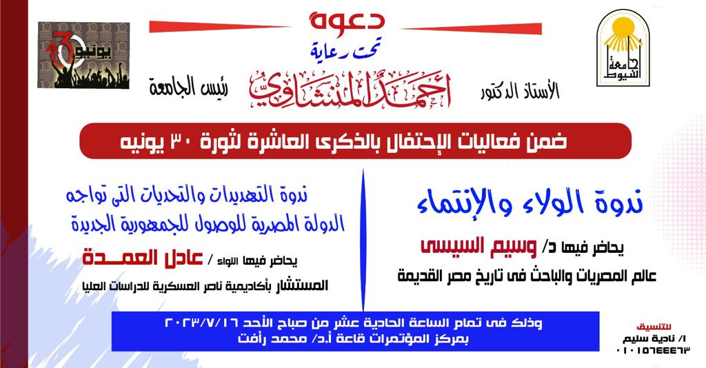 ينظم قطاع خدمة المجتمع وتنمية البيئة بجامعة أسيوط ، ندوتين توعويتين لطلاب الجامعة، تحت رعاية الدكتور احمد المنشاوي رئيس الجامعة، يوم الأحد 16 يوليو 2023، في إطار احتفالات جامعة أسيوط بالذكرى العاشرة لثورة 30 يونيه.