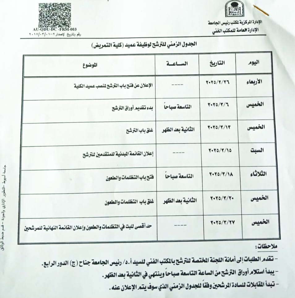 أعلنت اللجنة المختصة بترشيح عمداء جامعة أسيوط، برئاسة الدكتور أحمد المنشاوي، رئيس الجامعة، اليوم السبت 15 من مارس، القائمة المبدئية للمتقدمين للترشح لشغل منصب عميد كلية التمريض. ومن المقرر أن يتم فتح باب التظلمات والطعون يوم الثلاثاء 18 من مارس في تمام الساعة التاسعة صباحاً، على أن يتم غلق باب التظلمات والطعون يوم الخميس 20 من مارس في تمام الساعة الثانية بعد الظهر. كما من المقرر أن يتم يوم الخميس 27 من مارس الإعلان عن القائمة النهائية للمرشحين، بعد فحصها من اللجنة المختصة والبت فيها.