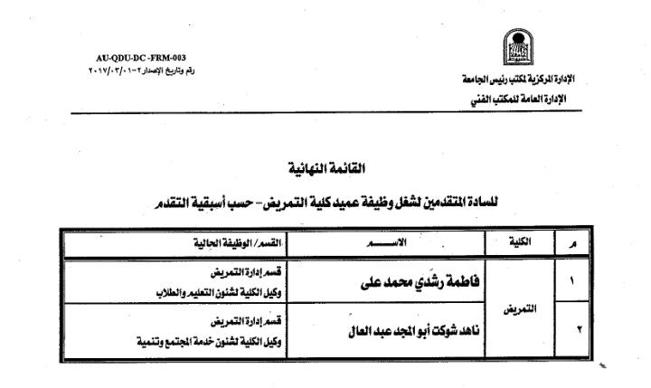 وتضمنت القائمة النهائية للمرشحين كلاً من: الدكتورة فاطمة رشدي محمد علي، الأستاذ بقسم إدارة التمريض ووكيل الكلية لشئون التعليم والطلاب، والدكتورة ناهد شوكت أبو المجد عبدالعال، الأستاذ بقسم إدارة التمريض ووكيل الكلية لشئون خدمة المجتمع وتنمية البيئة
