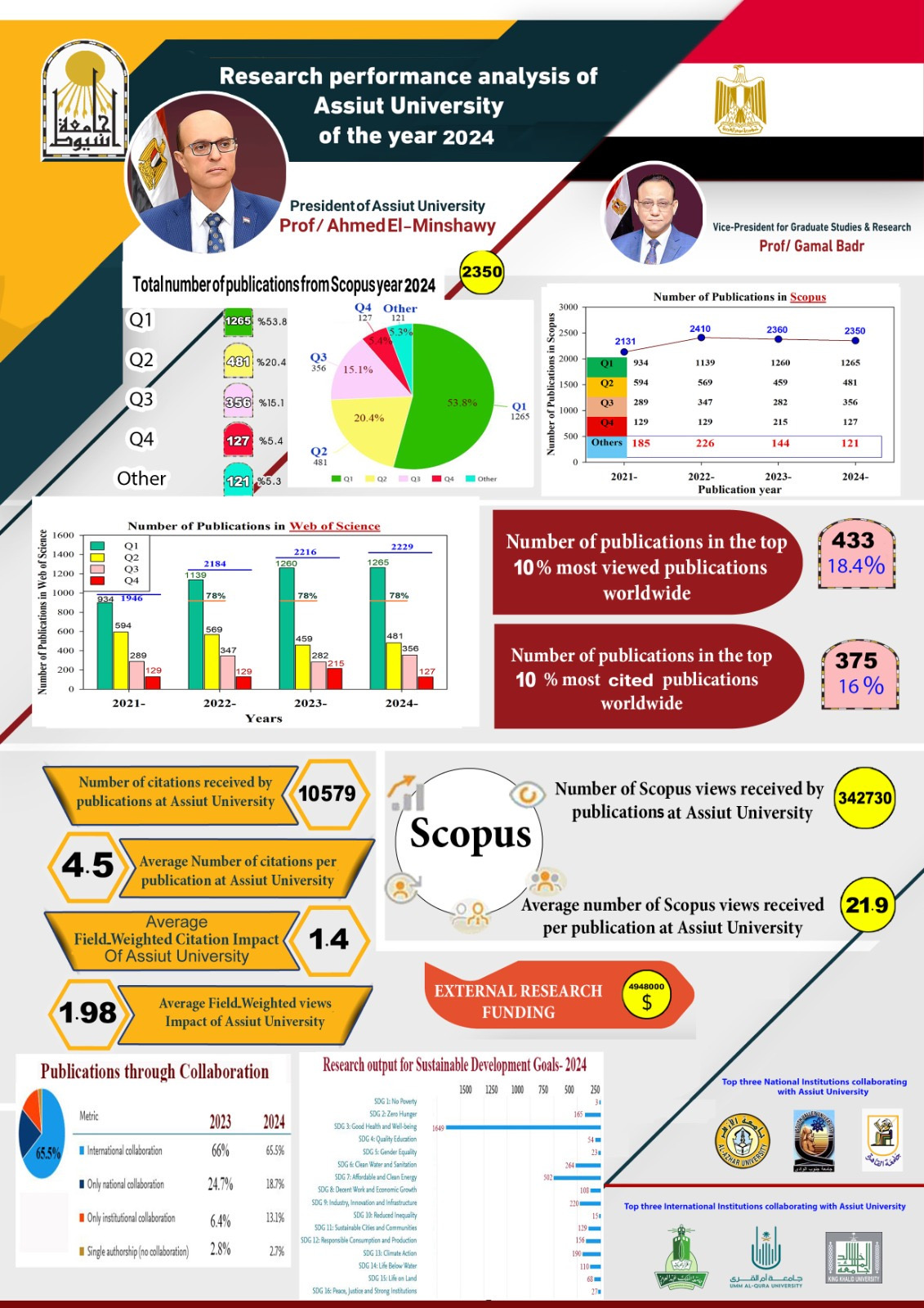 تحت رعاية الدكتور أحمد المنشاوي، رئيس جامعة أسيوط، وبإشراف الدكتور جمال بدر، نائب رئيس الجامعة لشئون الدراسات العليا والبحوث، كشفت الجامعة عن نتائج تحليل الأداء البحثي والنشر الدولي لعام 2024، والذي أظهر استمرار الجامعة في تحقيق تقدم ملحوظ على مستوى الكم والكيف في النشر العلمي، وفقاً للبيانات المستخرجة من قواعد بيانات Scopus وWeb of Science، وذلك من خلال منصة SciVal المعنية بتقييم الأداء البحثي للمؤسسات الأكاديمية عالمياً.